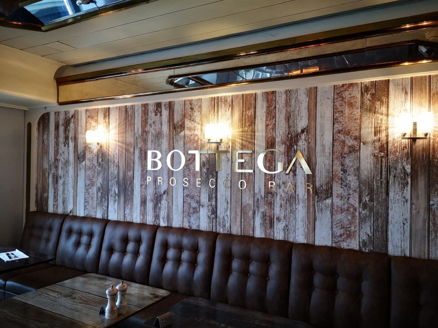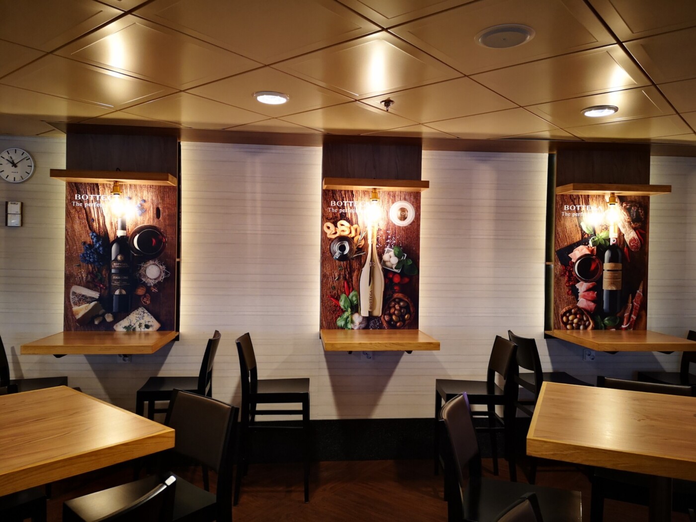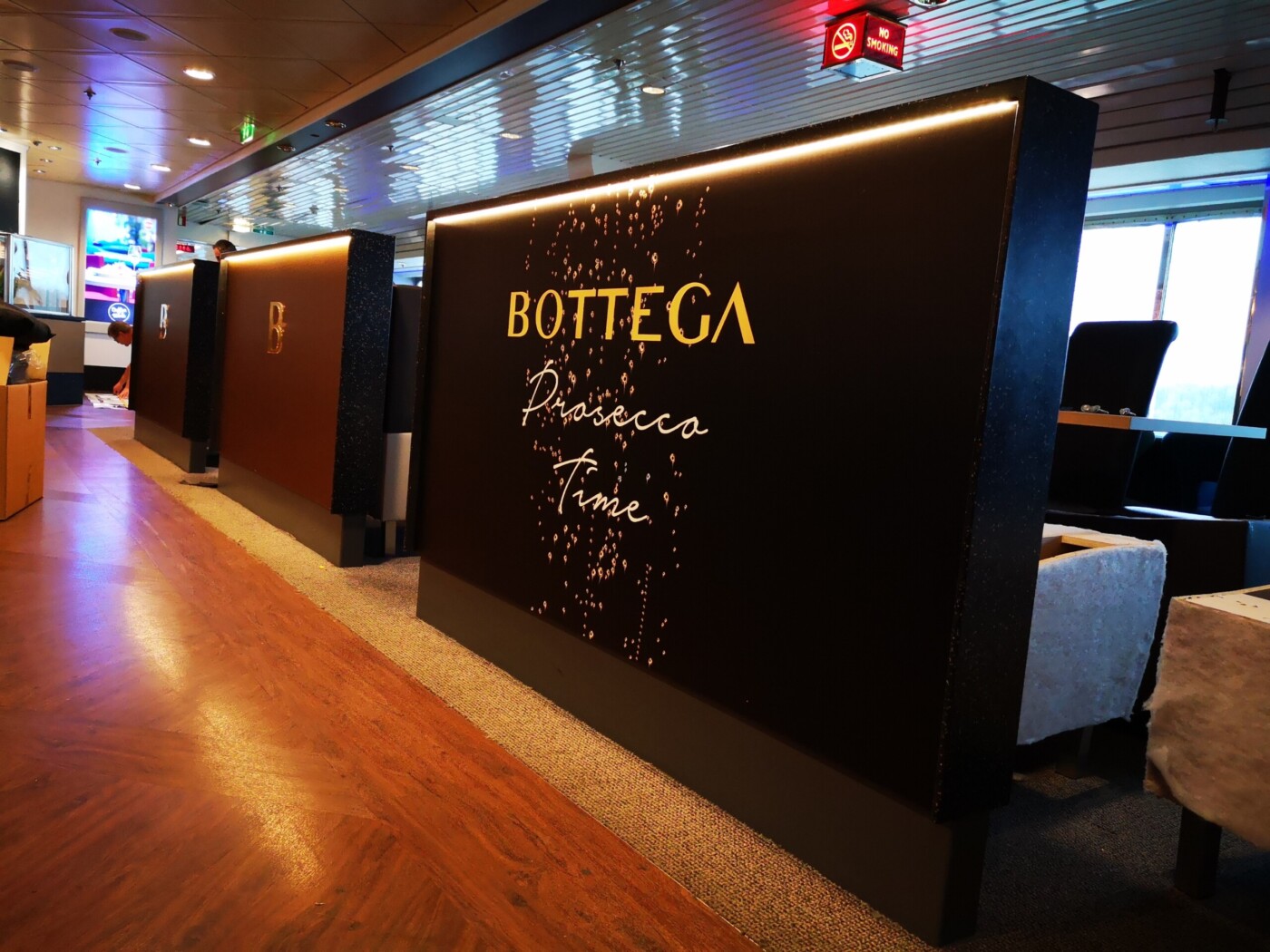 Toteutimme yhdessä Bottega:n ja Viking line:n kanssa ravintolan uudelleen brändäämisen. Lopputulos puhuu puolestaan. Tilasta tuli erittäin tyylikäs ja viihtyisä. Valitsimme toteutettavat materiaalit Bottega brändiä kuvaavasti. Kauniit akryylikirjaimet ja kromikulta antaa kauniin lopputuloksen.